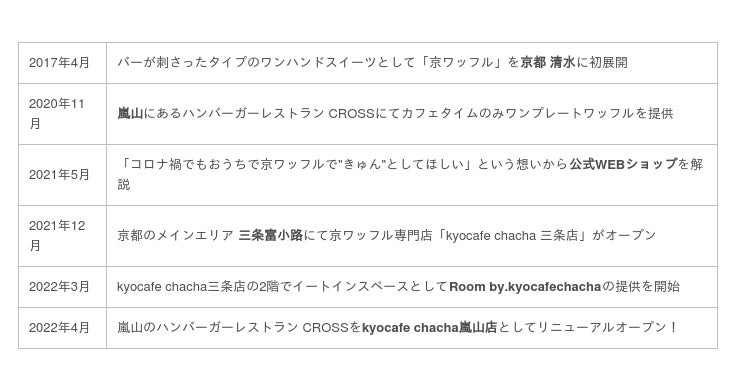ジャパンリゾート株式会社(本社:京都府京都市、代表取締役社長:松下美耶)が展開する「kyocafe chacha(キョウカフェ チャチャ)」は、2022年4月8日(金)京都 嵐山に2店舗目となるワッフル専門カフェ「kyocafe chacha 嵐山店」をグランドオープンいたします。京ワッフルを使ったランチプレートや、京都らしい宇治抹茶を使った限定フレーバー等、嵐山店限定のフレーバーも多数展開いたします。