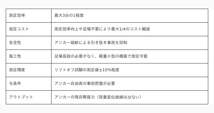 従来のリフトオフ試験と比較した技術検証でも、測定時間の短縮や同等程度の検査精度の確保のほか、緊張力が高くリフトオフ試験の適用ができないアンカーに対しても測定できることを確認しています。