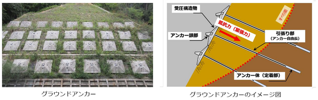 ※グラウンドアンカー:「アンカー工」と呼ばれる引っ張り材を地山に埋め込み、その引っ張り力(緊張力)によって斜面の滑動を抑止する対策工