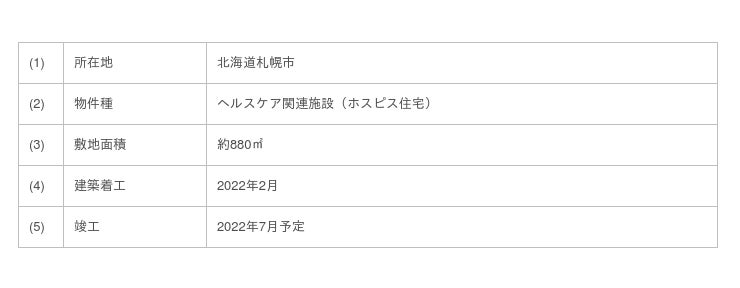 この度、第1号案件としてホスピス住宅を北海道札幌市で開発いたしますが、将来的には単科の専門病院や回復期リハビリテーション病院、有料老人ホームなどヘルスケア関連施設全般を開発対象とする展開も視野にいれ事業計画を策定中です。