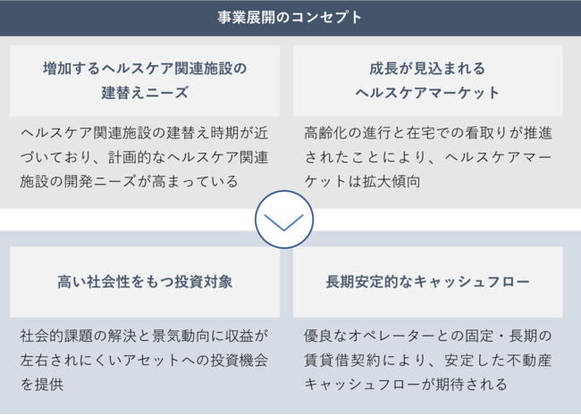 超高齢化社会である日本において、ヘルスケア関連施設の不足は社会的課題の1つであり、当社は新規施設をマーケットに供給する開発主体として、この社会的課題に取り組んでまいります。また、社会的インフラであるヘルスケア関連施設への投資はESG投資としても評価されており、かつ、コロナ禍の先行き不透明な投資環境下でも安定した収益を生むディフェンシブなアセットとして注目を集めています。