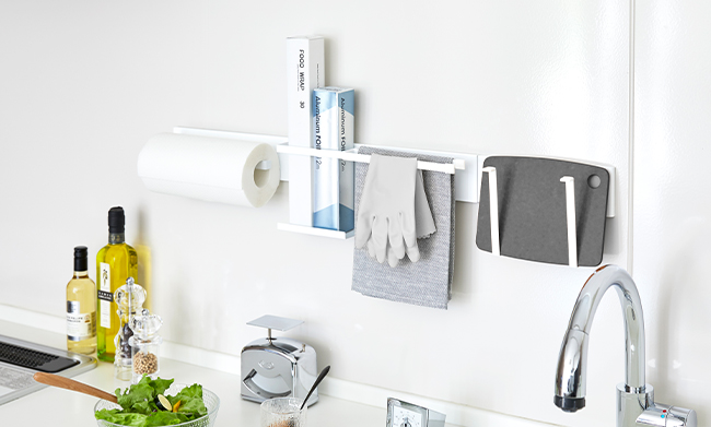 フィルムフックで光沢のあるキッチンパネルにカンタン取り付け。