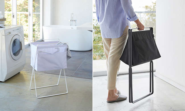 バスケットに高さがあるから、洗濯物の出し入れの際に腰への負担が軽減される高床式の折り畳みランドリーバスケット。