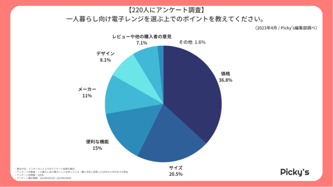 「Picky’s」は、インターネットショッピングにおいて、購入前に試せない・選ぶべきものがわからないという課題の解決を目標に、あらゆる商品のおすすめランキングや検証レビューを紹介するサイトです。このたびPicky’s(https://rentry.jp/note/)では、春の新生活に先駆けて、一人暮らし向け電子レンジについてインターネット上でアンケート調査を行いましたので発表いたします。