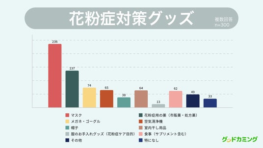 対処法の質問と関連して、花粉症対策として取り入れているグッズについても質問しています。