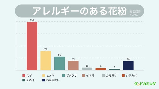 花粉症の原因となる花粉について複数回答可能な形式で質問したところ、「スギ」に最も反応すると回答した人が198人と圧倒的に多い結果となりました。