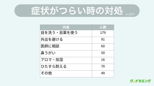 対処法として多かったのは「目を洗う・目薬を使う」179人。「外出を避ける」が91人、「医師に相談」が60人でした。