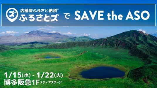 2025年1月15日(水)より博多阪急(福岡市博多区:阪急百貨店)で開催されるイベント「SAVE the ASO」の阿蘇市ブースにて期間中、店舗型ふるさと納税『ふるさとズ』(株式会社サンカクキカク 本社:福岡県久留米市)を用いた「ふるさと納税」サービスをご利用いただけます。