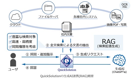 課題解決の鍵となったのは、QuickSolution(R)とRAG*1でした。QuickSolution(R)は、ファイルサーバや各種社内システムなどを横断的にファイルの中身まで検索できる純国産のエンタープライズサーチ(企業内検索システム)です。QuickSolution(R)はRAGを活用し、社内情報を検索した結果から質問応答を行う生成AI連携機能を提供しています。