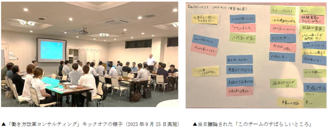 これらに先駆けて 2023 年 9 月 25 日 取り組みを開始するキックオフには、経営層・管理職・従業員などほぼ全社員の 35 名が参加しました。当日は、働き方改革の必要性についてのディスカッションや、自分たちが目指す取り組み目標を計画しました。今後、それぞれの部署の課題にあわせた解決策を検討・実施し、残業時間 20%削減、有給取得率 70%以上等を全社で目指します。