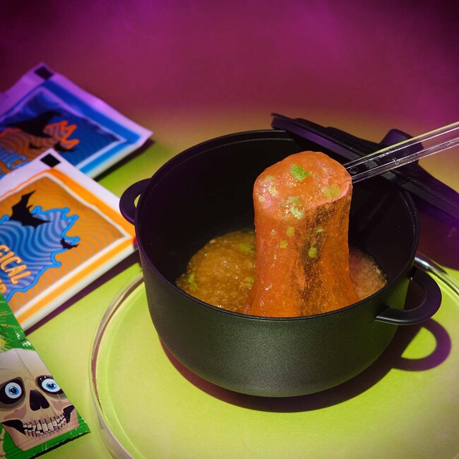 混ぜていくと色が変わる、スライムのように柔らかいオレンジフレーバーの不思議なお菓子です。付属のポッピングキャンディーをかければ、パチパチ弾けて楽しい食感に!さらに、お手持ちのブラックライトをあてると怪しく光って、パーティーを盛り上げてくれること間違いなし!