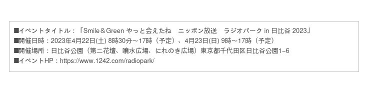 2006年にスタートした「ニッポン放送 ラジオパーク」は、10万人以上が来場したこともあるリスナーにはおなじみのイベントです。通算13回目となる今回の開催は、2019年4月以来4年ぶりの開催となります。今回のタイトルは「Smile&Green やっと会えたね ニッポン放送 ラジオパーク in 日比谷2023」。リスナーとの“再会”を「やっと会えたね」のキャッチフレーズで表現しています。