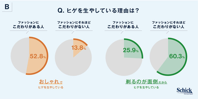 ファッションにこだわりがある人の18.8%が「ヒゲを生やし、整えている」と回答し、ファッションにそれほどこだわりがない人の4.3%と比べて4倍以上という結果になりました。また、ヒゲを生やしている理由については、ファッションにこだわりがある人の52.8%が「おしゃれで」と回答し、半数以上がヒゲを“ファッションアイテム”として最大限に活用しているということが伺えます。一方、ファッションにそれほどこだわりがない人がヒゲを生やす理由は、60.3%が「剃るのが面倒だから」。ファッションにこだわりがある人の25.9%と比べても2倍以上の差があり、「ヒゲ」をおしゃれとして考えているかどうかの意識の違いが鮮明になりました。