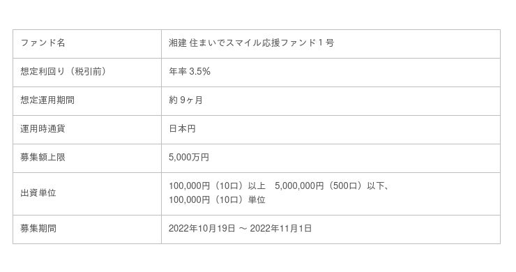 「未来をわかちあう投資」を提供する「Funvest(ファンベスト)」(以下、Funvest)は、「湘建 住まいでスマイル応援ファンド1号」(以下、本ファンド)の募集を10/19より開始しますので、お知らせいたします。