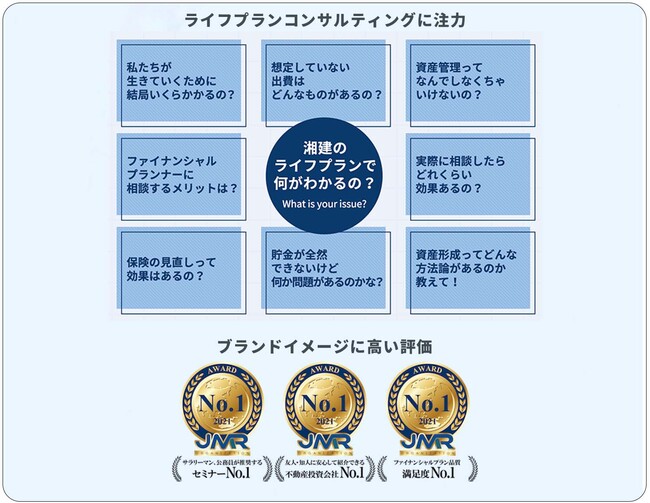 その結果、同社は日本マーケティングリサーチ機構によるブランド名のイメージ調査(2021年9月)において、「サラリーマン、公務員が推奨するセミナー」「友人・知人に安心して紹介できる不動産投資会社」「ファイナンシャルプラン品質」の3項目において第1位を獲得しました。