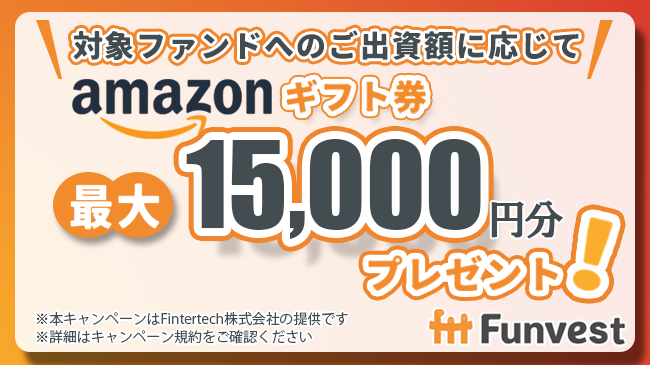 また、本ファンドへの出資額に応じて最大15,000円分のAmazonギフト券をプレゼントするキャンペーンを併せて実施いたします。