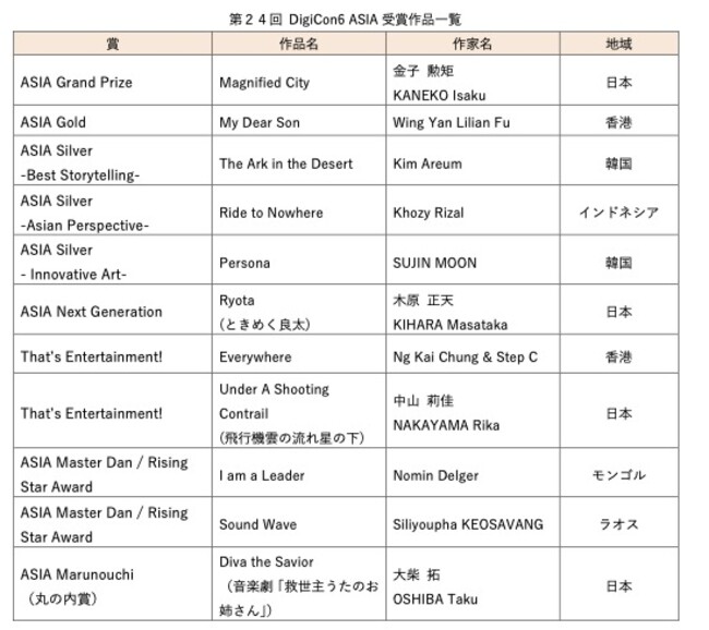 TBSホールディングスが主催する「第24回 DigiCon6 ASIA Awards 授賞式」が11月19日(土)に 東京・丸ビルホールで開催された。今回は、イラン、バングラデシュが初参加となり日本を含めアジア16 地域が参加。各地域から選抜された作品の中から、最も優れたグランプリには、日本作品の金子勲矩さん(2 8)作「Magnified City」が選ばれた。