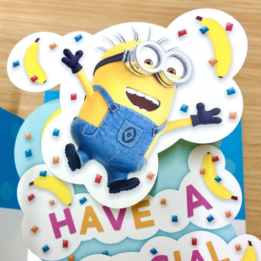 カードを開くとバネ付きの「ミニオン」が勢いよくポップアップ! 音源はミニオン語の「BEE-DO-BEE-DO-」から始まる、ユーモアがたっぷり詰まったバースデーカードです。