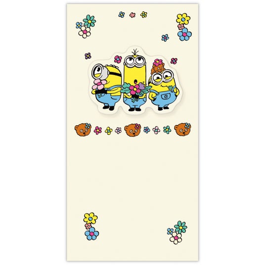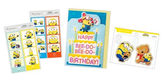 バネ付きで飛び出すオルゴールカードや、ミニオン語が楽しいグリーティングカード、お祝いシーンで多用途に使える金封、さらに4コマ漫画風・ペア仕様・アクリル素材のシールまで、充実のラインナップ!