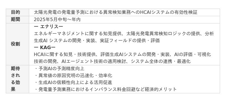 株式会社エナリス(本社:東京都千代田区、代表取締役社長:都築実宏、以下エナリス)とKDDIアジャイル開発センター株式会社(本社:東京都港区、代表取締役社長/CEO:木暮 圭一、以下KAG)は2025年5月中旬より、太陽光発電量予測の異常検知システムにHCAI(人が中心のAI/ Human-Centered AI)を組み込む共同実証を開始しました。