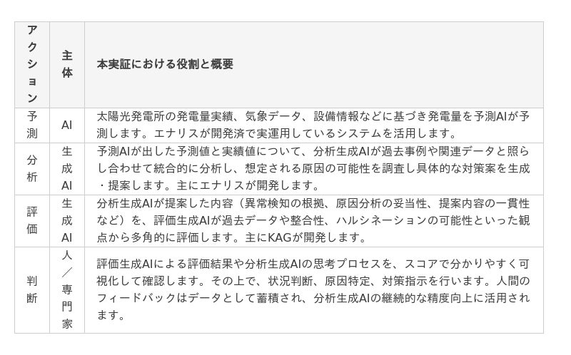 本実証では、KAGが生成AI・HCAIの知識・技術を提供し、エナリスが生成AI・HCAIの開発を実施、システム構築は両社共同で行います。