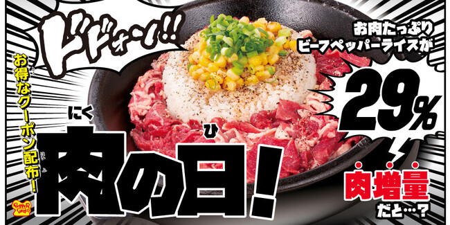株式会社ホットパレット(本社:東京都江東区、代表取締役社長:松本純男)が運営するペッパーランチは、1月29日(日)の“肉の日”限定で、「お肉たっぷりビーフペッパーライス」のお肉を通常より29%増量して販売いたします。さらに、当日ご来店の上、ペッパーランチの主商品をご注文いただいたお客様には、ビーフペッパーライスをご注文いただくとトッピング5種(目玉焼き・チーズ・コーン*1・もやし・ブロッコリー)をサービスする「肉の日サンクスクーポン」をプレゼントいたします。
