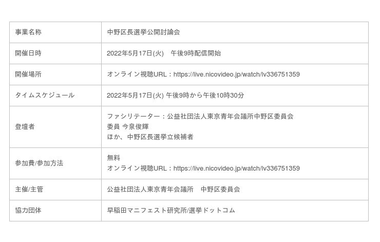 公益社団法人東京青年会議所中野区委員会は、中野区長選挙の公開討論会を5月17日(火)午後9時からニコニコ生放送にて配信いたします。