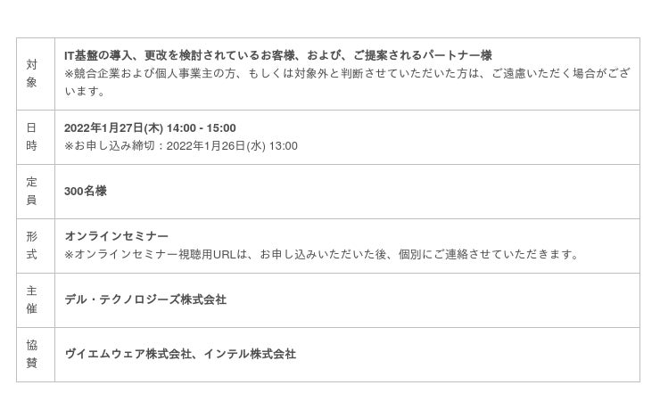 オロは、2022年1月27日(木)、デル・テクノロジーズ株式会社様主催のオンラインセミナーに登壇し、「Dell EMC VxRail」の導入前の課題から導入に至った経緯、そして本番稼働後の効果までをご紹介させていただくことになりましたのでお知らせいたします。