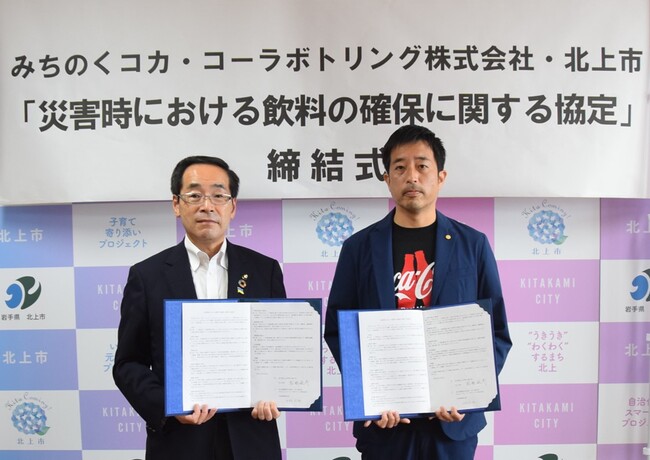 このたび、みちのくコカ・コーラボトリング株式会社(本社: 岩手県盛岡市、代表取締役社長: 谷村 広和)は、岩手県北上市(市長: 高橋 敏彦)との間で、「災害時における飲料の確保に関する協定」を締結することとし、8月24日(水)に締結式を開催いたしました。