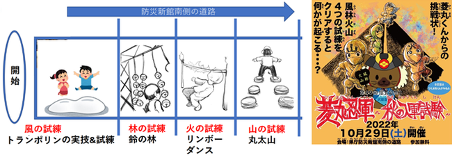 今回のイベントは、参加者が力を合わせて菱丸忍軍が仕掛けた「風・林・火・山」4つの試練をクリアすると武田菱丸※の巨大バルーンが出現し、記念撮影が可能となります。