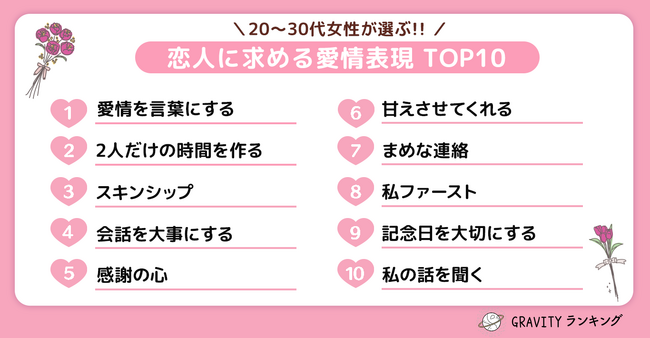 今回のテーマは、20代~30代女性が選ぶ!!「恋人に求める愛情表現TOP10」