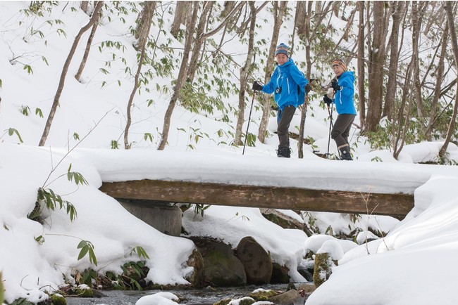 雪の上を歩くための道具「スノーシュー」を履いて、鹿沢の森に出かけます。特別な技術がなくても気軽にハイキングが出来るため、スキーやスノーボードが苦手な方も、冬の大自然を楽しむことができる人気のアクティビティです。フワフワの雪の上を歩いたり、動物たちの痕跡を探したり。お天気が良ければ、嬬恋村や浅間山を一望する、標高1746メートルの村上山山頂を目指します。ガイドが同行しますので、初心者の方も安心です。