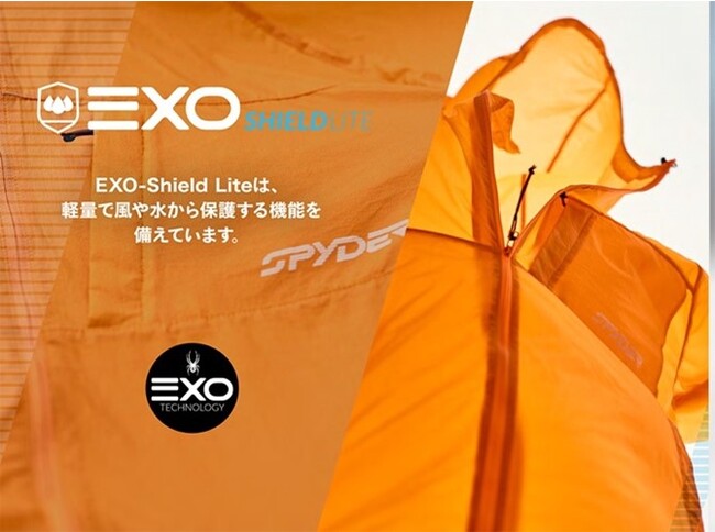 エクソシールドライトはスパイダーによって開発された素材で軽量化に特化しながらもさまざまな気象条件から保護し、撥水性、防風性を兼ね備えている万能素材です。
