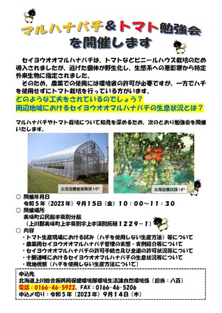 野外に定着したセイヨウオオマルハナバチの防除を担う市民、団体と農業関係者の相互理解を深めるため、次のとおり勉強会を開催します。ふるってご参加ください!