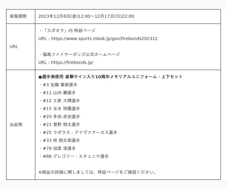 【福島ファイヤーボンズ10周年記念オークション 概要】