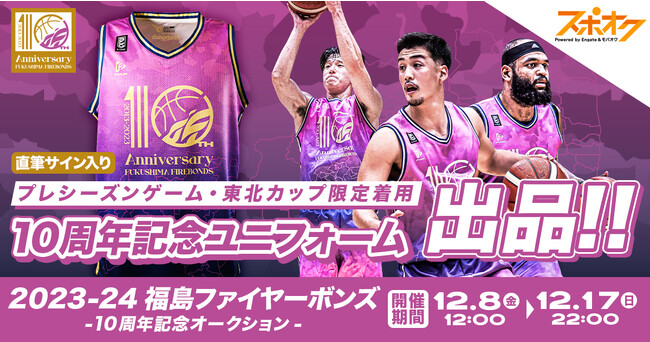 株式会社モバオク(本社:東京都渋谷区、代表取締役社長:生田目 知之、以下モバオク)とエンゲート株式会社(本社:東京都中央区、代表取締役:城戸 幸一郎、以下エンゲート)が協働し提供するスポーツチーム公式オークションサービス「スポオク」は、B2所属の福島ファイヤーボンズを運営する福島スポーツエンタテインメント株式会社(以下、福島ファイヤーボンズ)が実施する「福島ファイヤーボンズ10周年記念オークション」を2023年12月8日(金)から開始します。