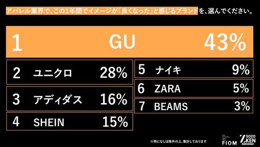 トレンドをいち早く手頃な価格で提供する『GU』が4割以上の支持を獲得!圧倒的なコストパフォーマンスとデザイン性が高く評価される結果に。