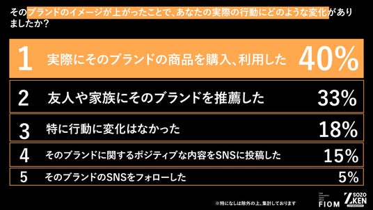 ブランドイメージが「爆上がり」した最大の理由は「商品やサービスそのものが大幅に改善された/とても良かった」(42%)が圧倒的1位。「好きな有名人や『推し』とのコラボレーション」(17%)を大きく上回り、Z世代のプロダクト本質主義が浮き彫りになりました。また、好感度の高まりは「実際の購買」(40%)へ直結しています。