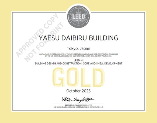 ダイビル株式会社(社長:丸山卓、本社:大阪市北区、以下「当社」)は、2025年6月30日に竣工した「八重洲ダイビル」において、米国の建物環境認証システムLEED 認証建物新築カテゴリーである「LEED v4 Building Design and Construction: Core and Shell(LEED v4 BD+C: CS)」にて「LEED GOLD(R)」を取得しましたのでお知らせします。