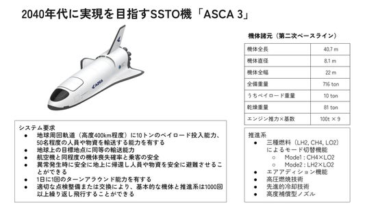 ISCは、2040年代を目標に、地球周回軌道(高度400km程度)に10トンのペイロード投入能力、50名程度の人員や物資を輸送する能力を有するSSTO: Single Stage To Orbit(単段式宇宙往還機)の「ASCA 3」(アスカ・スリー)の実現を目指しています。