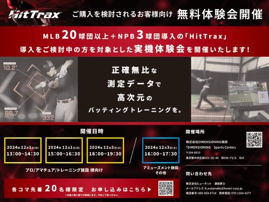 「HitTrax Pro」体験会を12月1日(日)/3日(火)、東京都中央区新川「DIMENSIONING Sprots Center」にてトレーニング施設/団体・アミューズメント施設向けに開催。
