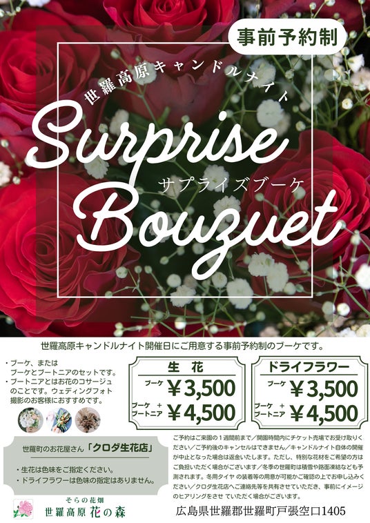 世羅高原キャンドルナイトでは開催期間中、事前予約制でブーケをご用意しています。ファンタスティックポートレートでのブライダル撮影にも使っていただけます。ブーケとブートニア(コサージュ)のセットもご用意していますので、あわせてご利用ください。