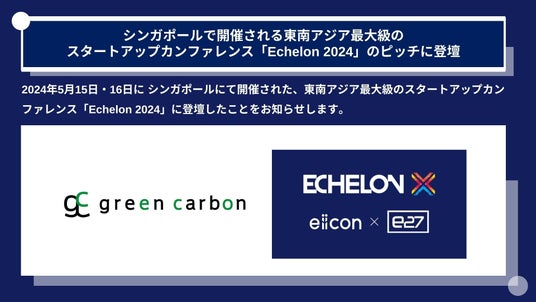 Green Carbon株式会社(代表取締役:大北潤、以下Green Carbon(読み:グリーンカーボン))はこの度、日本最大級のオープンイノベーションプラットフォーム「AUBA(アウバ)」を運営する株式会社eiicon(代表取締役社長:中村 亜由子、以下「eiicon」)とe27が主催し、2024年5月15日・16日に シンガポールにて開催された、東南アジア最大級のスタートアップカンファレンス「Echelon 2024」に登壇したことをお知らせします。