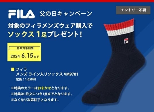対象のFILAウェアを購入すると、メンズソックス(VM9781)がもれなくもらえるキャンペーンとなります。