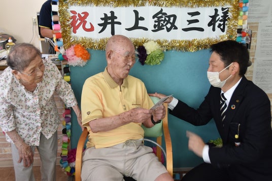 対象の方(最高齢の方(男女各1名)及び満100歳となる方39名)のご自宅等を訪問し、「長寿祝金」を贈呈します。祝福と敬意の気持ちを、市長等が直接お伝えします。