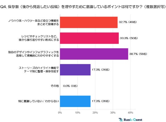 一方、「ストーリーズのハイライト機能でテーマ別に整理・保存を促す」(17.3%)や、「特に意識していない/わからない」(17.3%)といった回答も一定数あり、保存数を増やす具体的な工夫がまだ広く浸透しているわけではない様子も見てとれます。