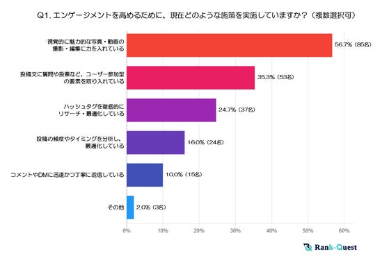 本アンケートからは、Instagram運用においてエンゲージメントを高める手段として、視覚的に魅力的な写真や動画の作成・編集が最も重視されていることがわかりました。