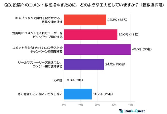 一方、「特に意識していない/わからない」(16.7%)という回答も一定数あり、コメント数の増加施策については手探りの段階にあるアカウントも少なくないようです。