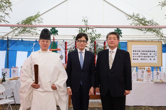 今回の地鎮祭では、修祓(しゅばつ)により参列者や祭場を清めた後、降神の儀(こうしんのぎ)にて神々をお迎えし、祝詞奏上(のりとそうじょう)により工事の趣旨と祈願を奉告しました。その後、鍬入れ(くわいれ)や鎮物埋納にあたる地鎮の儀(じちんのぎ)、参列者による玉串奉奠(たまぐしほうてん)、撤饌(てっせん)、昇神の儀(しょうしんのぎ)へと進み、厳粛なうちに祭祀を終えました。