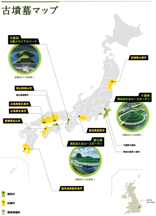 当社は、日本古来の前方後円墳を忠実に再現した樹木葬「古墳墓(こふんぼ)」の開発・販売を行う終活関連事業者です。現在、千葉県・香川県・大阪府において3基の古墳墓が完成・販売されており、全国で100基の古墳墓の開発を目指しています。